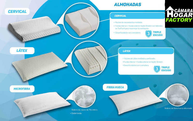 Cervical: núcleo viscoelástica moldeada. Funda interior y exterior con tejido stretch y laterales en Texfan para aumentar la transpirabilidad.